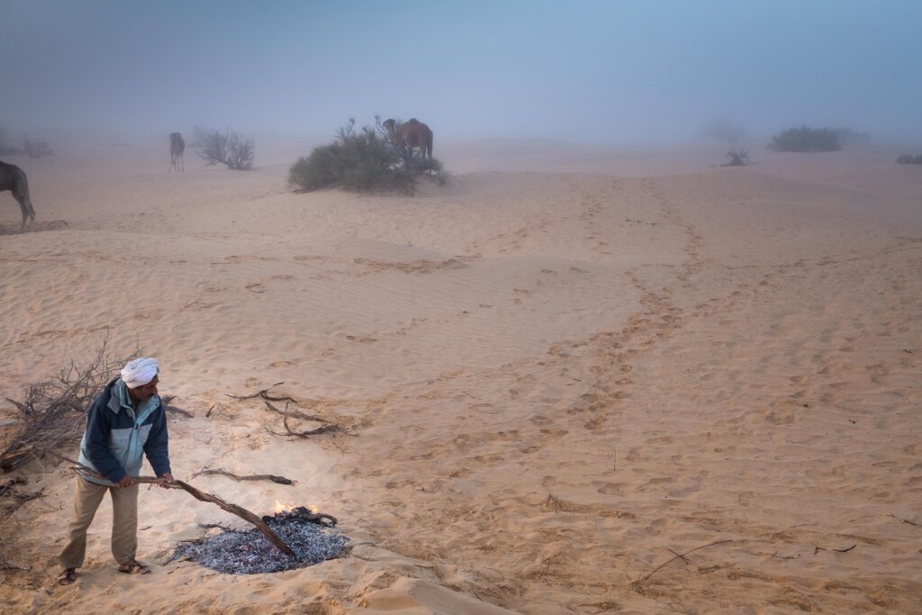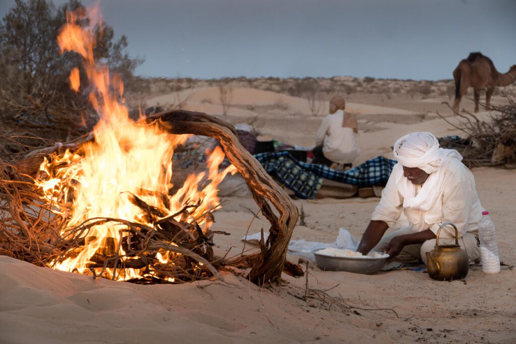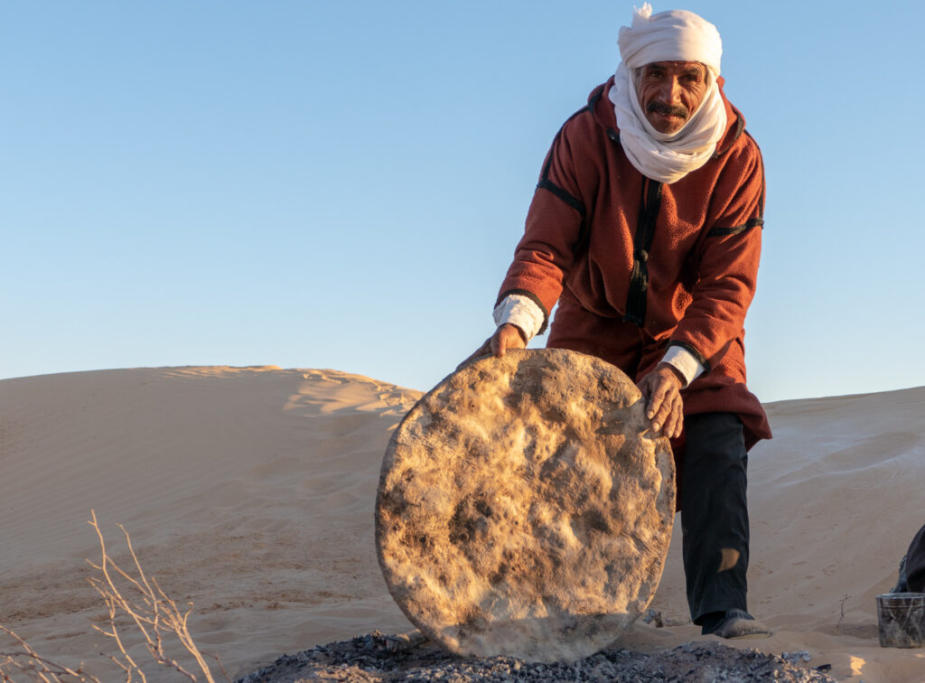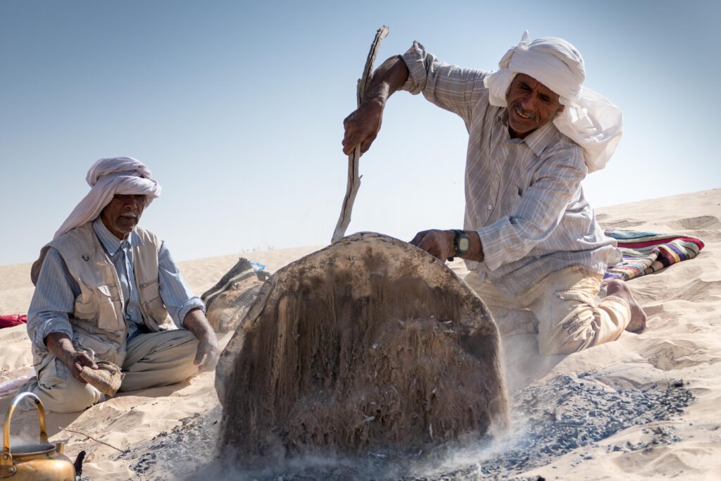 Am Rand des Lagers hockten zwei Beduinen der Karawane im Sand. Der Morgen war kühl, der Himmel weit und still. Sie kneteten Teig aus Mehl, Wasser und Salz – einfache Gaben, doch in der Wüste von unschätzbarem Wert. Ein Feuer glomm. Wenn die Glut reif war, legten sie die flachen Fladen hinein, bedeckten sie mit glühend heißem Sand und warteten. Der Duft des Brotes stieg auf, vermischte sich mit dem Rauch, mit der trockenen Luft und der leisen Freude, dass es etwas zu essen gab.
