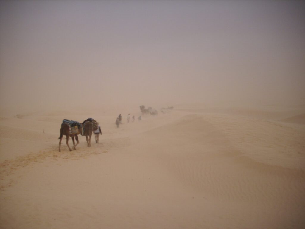 Die Karawane bewegte sich langsam über die Dünen, als ein leiser Wind aufkam. Zunächst streifte er nur sanft den Sand über ihre Füße, flüsterte durch die Gepäckstücke auf den Kamelen. Doch bald wurde der Wind stärker. Der Sand stieg auf, drehte sich in Wirbeln und kratzte an Gesicht und Händen. Die Kamele senkten die Köpfe, die Wanderer suchten Schutz.
