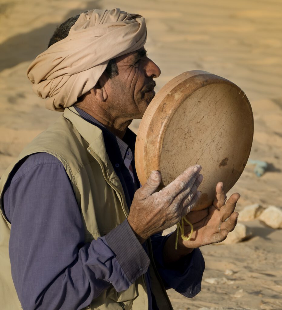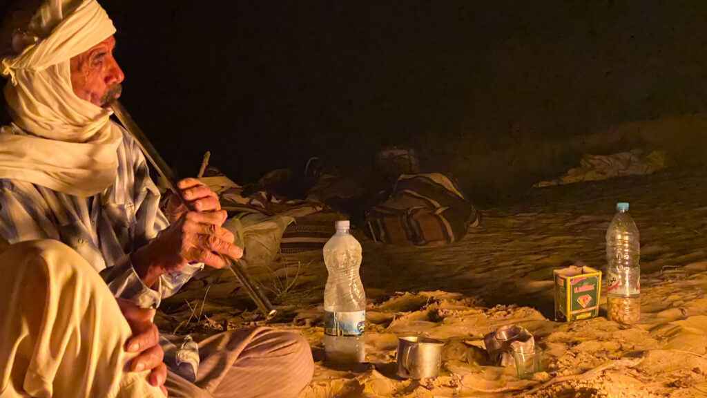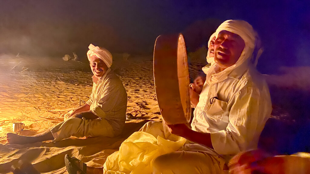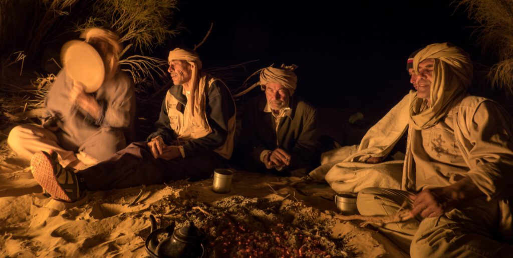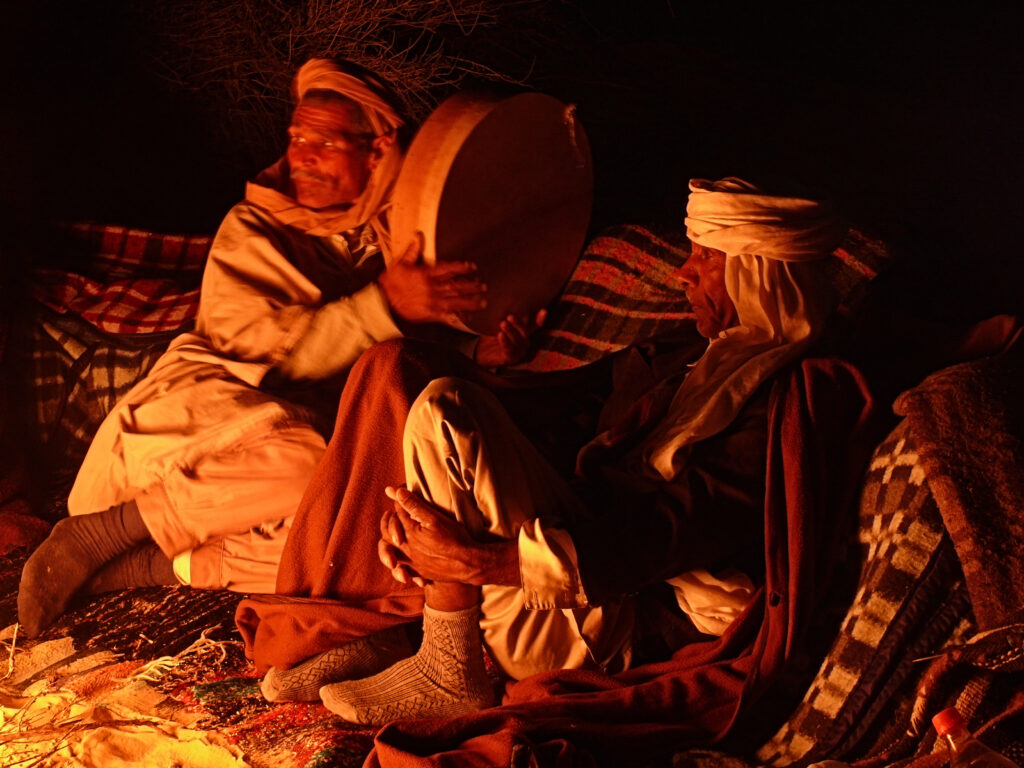 Wenn die Sonne versinkt und die Schatten länger werden, erwacht am Lager das Leben neu. Die Beduinen entzünden das Feuer, kochen Tee und sitzen beisammen. Einer beginnt leise zu singen – ein Lied, das von der Wüste erzählt, von den Sternen, vom Durst, von der Liebe und der Sehnsucht nach der Ferne. Bald stimmen andere mit ein, klatschen den Rhythmus, erfinden neue Strophen.