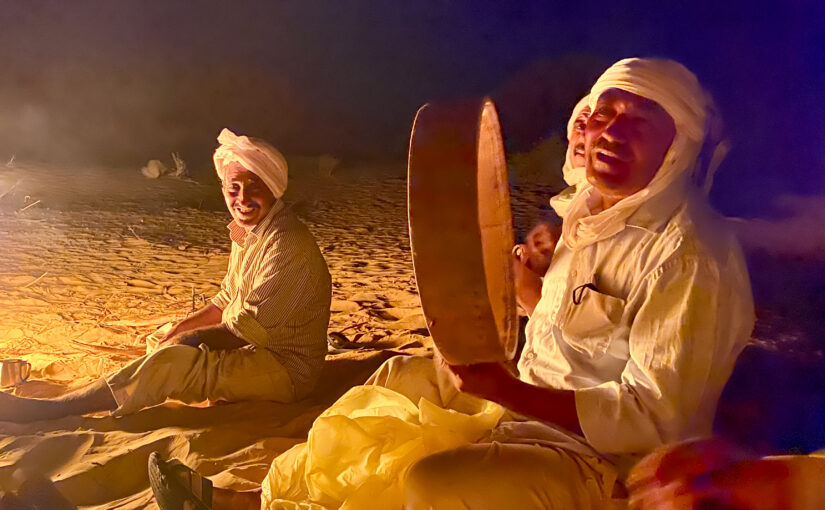 Wenn die Sonne versinkt und die Schatten länger werden, erwacht am Lager das Leben neu. Die Beduinen entzünden das Feuer, kochen Tee und sitzen beisammen. Einer beginnt leise zu singen – ein Lied, das von der Wüste erzählt, von den Sternen, vom Durst, von der Liebe und der Sehnsucht nach der Ferne. Bald stimmen andere mit ein, klatschen den Rhythmus, erfinden neue Strophen.