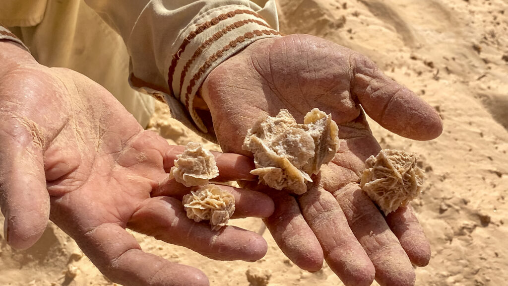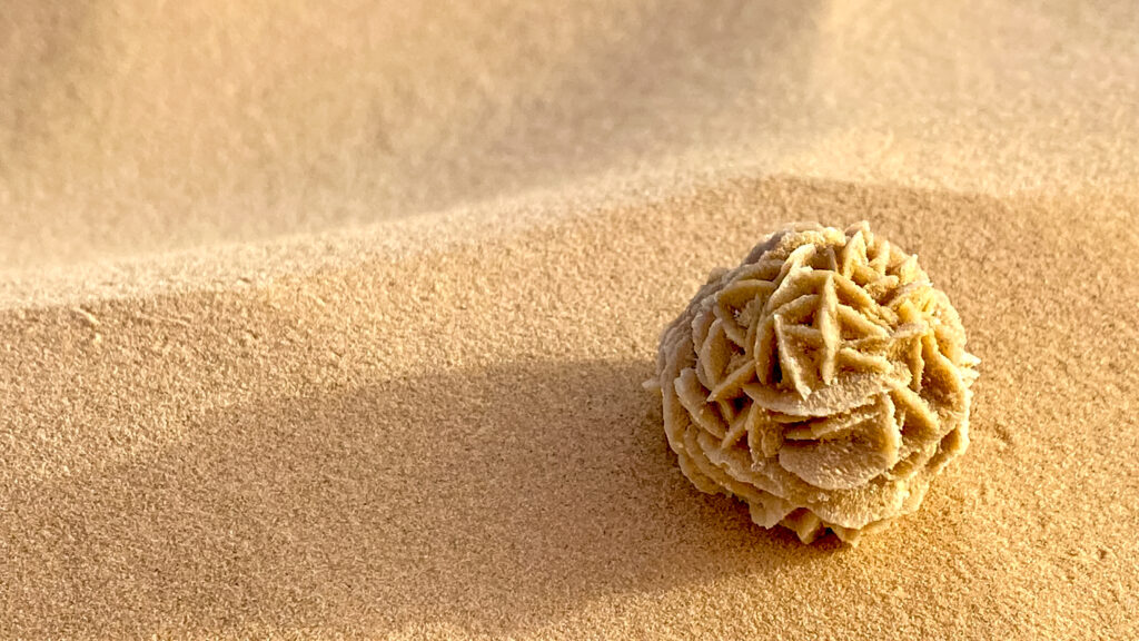 Zwischen dem Sand entdeckte er auch Sandrosen, kunstvolle Kristallformationen aus Mineralien, die wie kleine Blumen im trockenen Boden lagen. Ihre zarten Schichten hatten Jahrtausende überdauert, vom Wind geformt, vom Sand poliert.