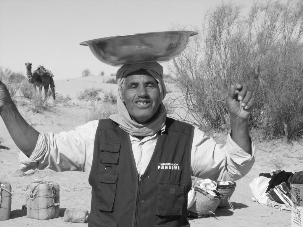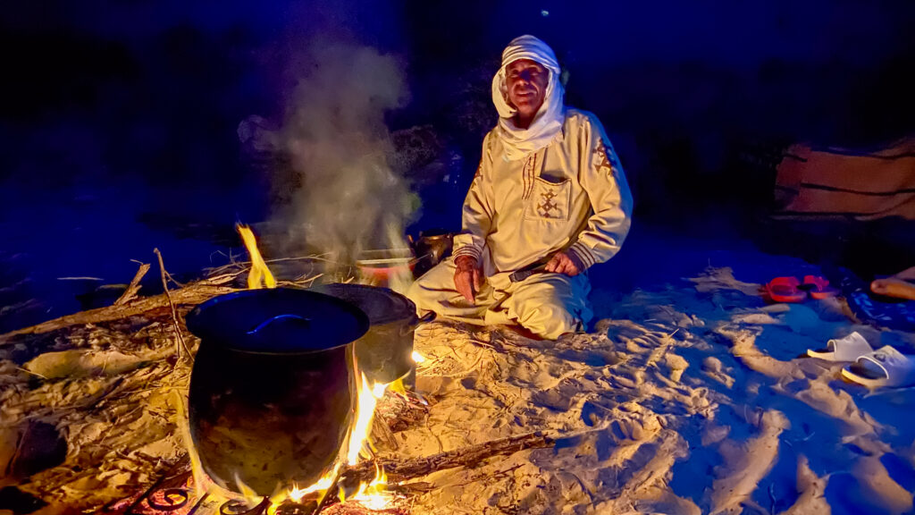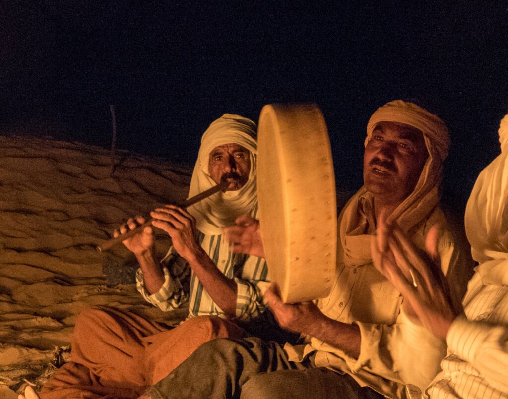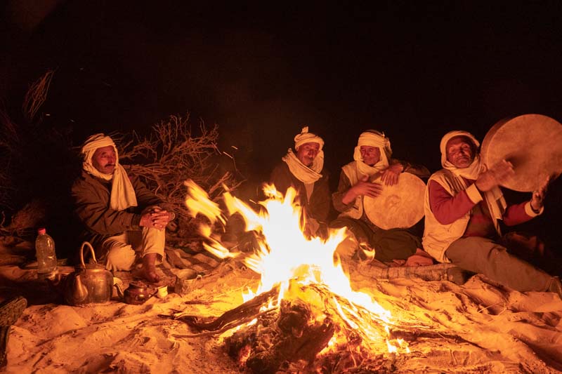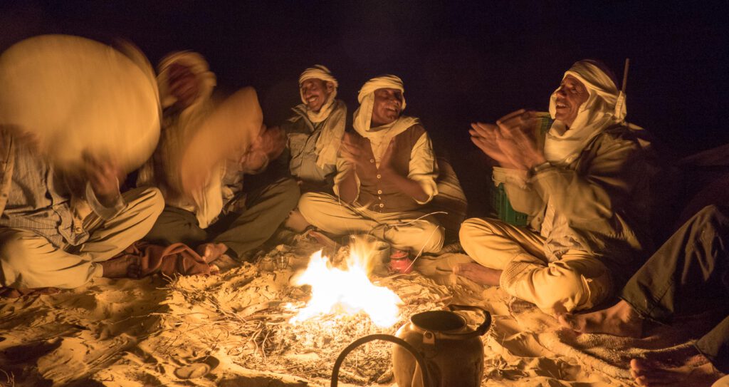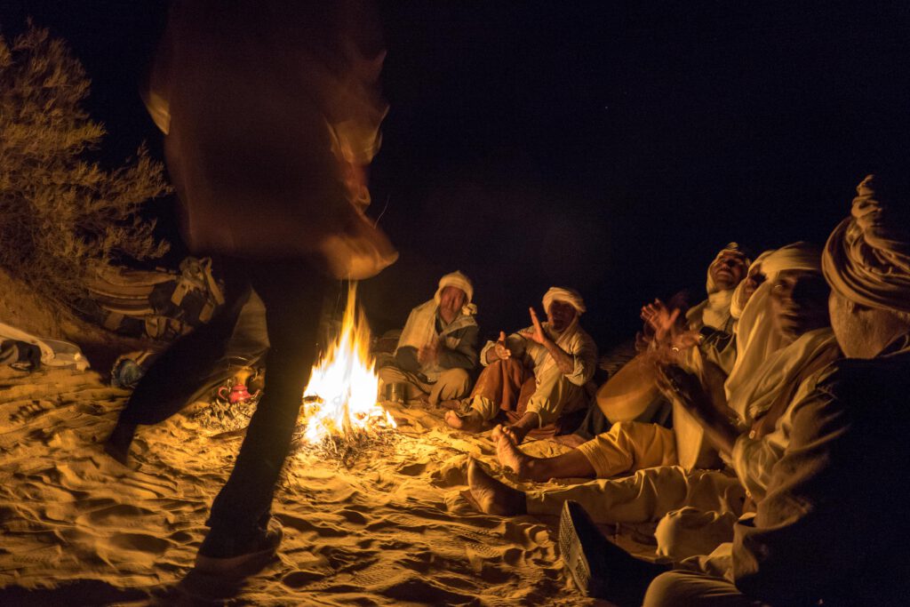 Einer der Beduinen nimmt die Trommel zur Hand – leise erst, dann lauter. Ein Rhythmus entsteht, gleichmäßig wie der Herzschlag der Wüste. Bald klatschen andere mit, einer erhebt sich, beginnt sich im Kreis zu bewegen, Schritt für Schritt im Takt der Trommel. Dann folgen weitere Nomaden. Der Sand wird zur Bühne, die Nacht zum Fest.