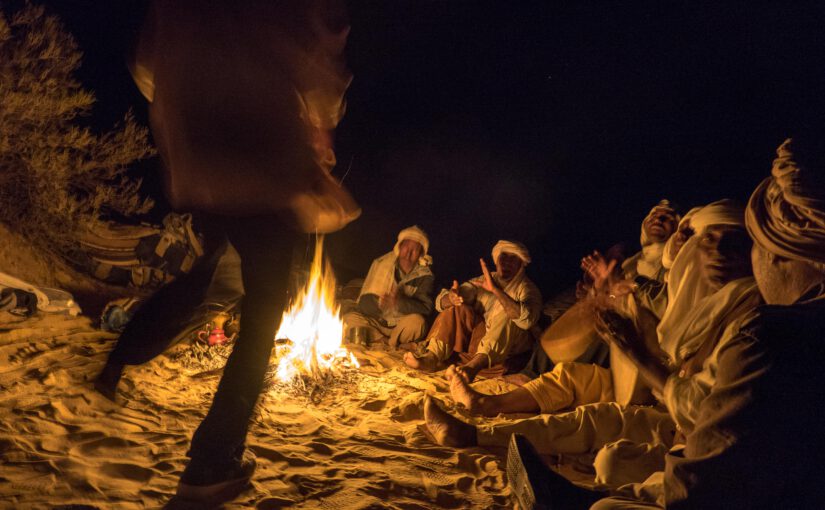 Einer der Beduinen nimmt die Trommel zur Hand – leise erst, dann lauter. Ein Rhythmus entsteht, gleichmäßig wie der Herzschlag der Wüste. Bald klatschen andere mit, einer erhebt sich, beginnt sich im Kreis zu bewegen, Schritt für Schritt im Takt der Trommel. Dann folgen weitere Nomaden. Der Sand wird zur Bühne, die Nacht zum Fest.